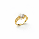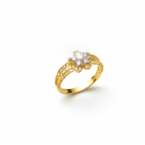 The Open-Work Floral Ring is the epitome of subtle femininity and charm. Made from yellow gold, it features a single round white stone at its center surrounded by a delicate three-petal flower motif on a slim band. A perfect statement piece for those who favor timeless and understated elegance.