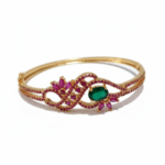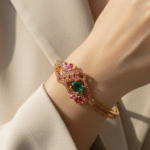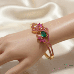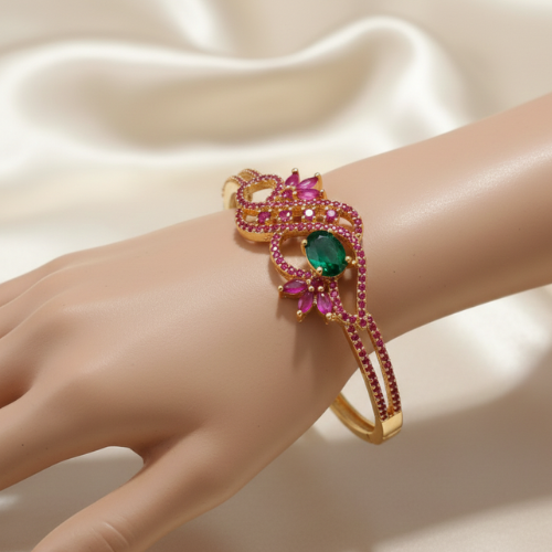 The bracelet’s eye-catching floral and loop design is crafted with meticulous attention to detail. The interplay of warm gold tones, soft pink stones, and the striking green centerpiece creates a harmonious and upscale aesthetic. This bracelet doesn’t just add to your outfit but commands attention wherever you wear it.