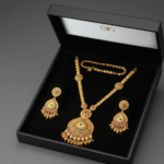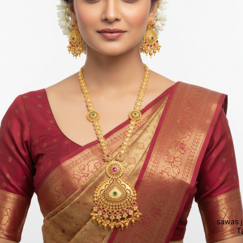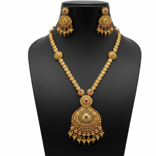 The traditional gold necklace set is a masterpiece that embodies timeless beauty and sophistication. Featuring an intricate long-chain design, this piece highlights the delicate artistry of skilled craftsmanship. The detailed circular pendant serves as a focal point, adding a touch of grandeur to your overall look. Each element of this set is thoughtfully crafted, ensuring a perfect balance of tradition and style.