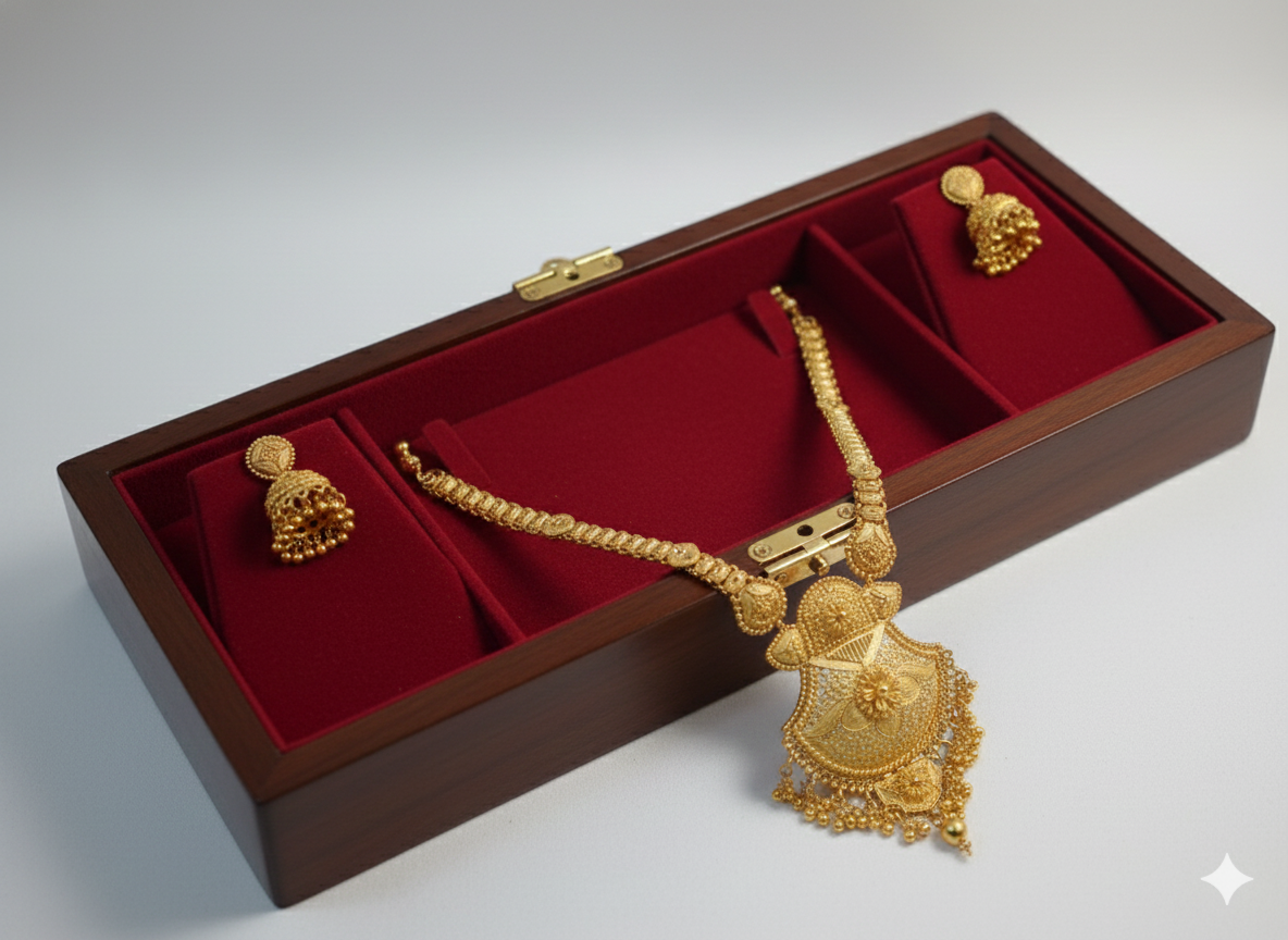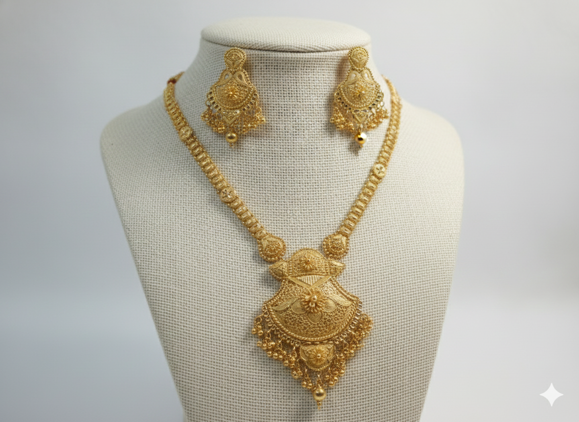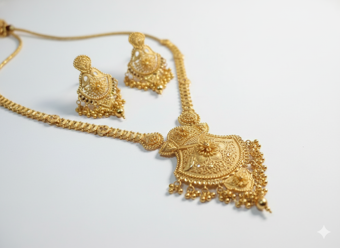Every element of this gold-plated necklace set is crafted with precision and care. The detailed floral designs not only exude artistry but also a sense of tradition, connecting timeless beauty with contemporary trends. The matching jhumka earrings amplify the set’s allure, ensuring you stand out effortlessly at any event. Whether you’re wearing a sari, lehenga, or an elegant gown, this set seamlessly complements your outfit, adding a royal touch to your ensemble.