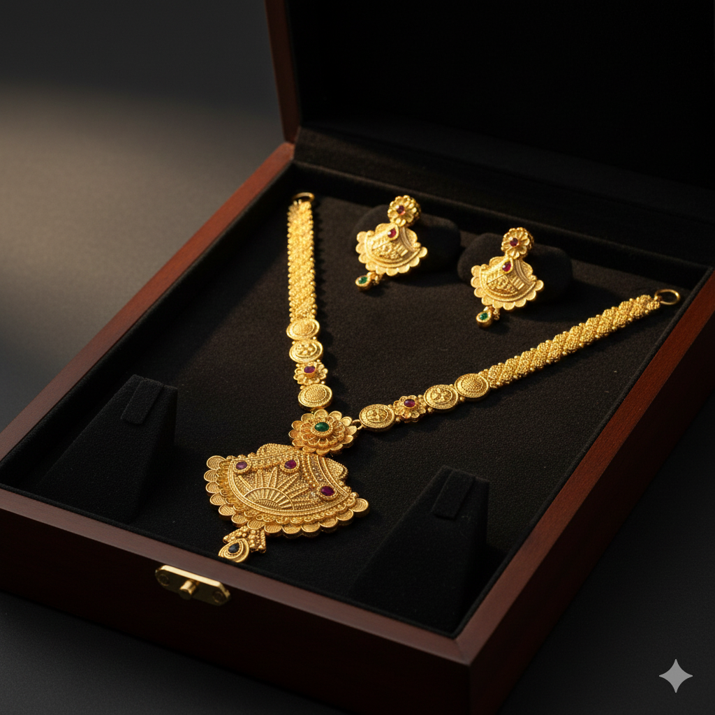 This necklace set is crafted using high-quality materials and a durable gold-plating process, ensuring both longevity and a premium finish. The intricate detailing, combined with the stone accents, speaks to the artisan’s dedication and skill. Whether you’re gifting it to someone special or indulging in a personal treat, this elegant set is a wonderful way to celebrate culture and style.