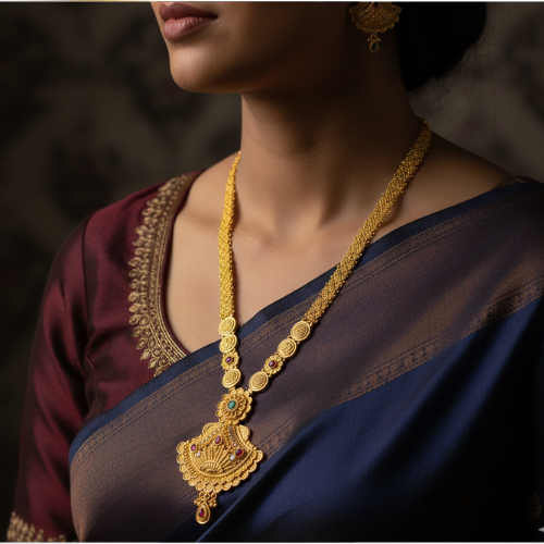 Make every moment memorable by enhancing your ensemble with our traditional gold-plated necklace set. Its radiant design and festive charm are sure to leave a lasting impression.04