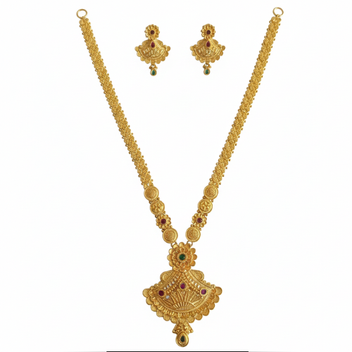 Step into the world of timeless beauty with our traditional gold-plated necklace set. Designed with meticulous attention to detail, this stunning piece showcases the richness of heritage while offering a modern touch of sophistication. The intricate gold detailing perfectly complements the vibrant red and green stone accents, making it a standout accessory for ethnic attire.