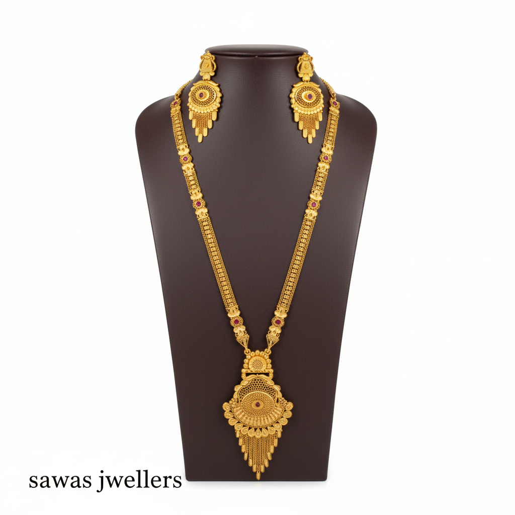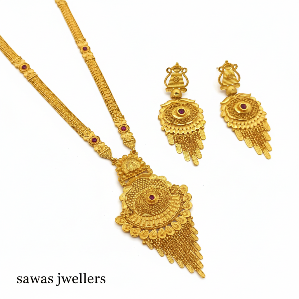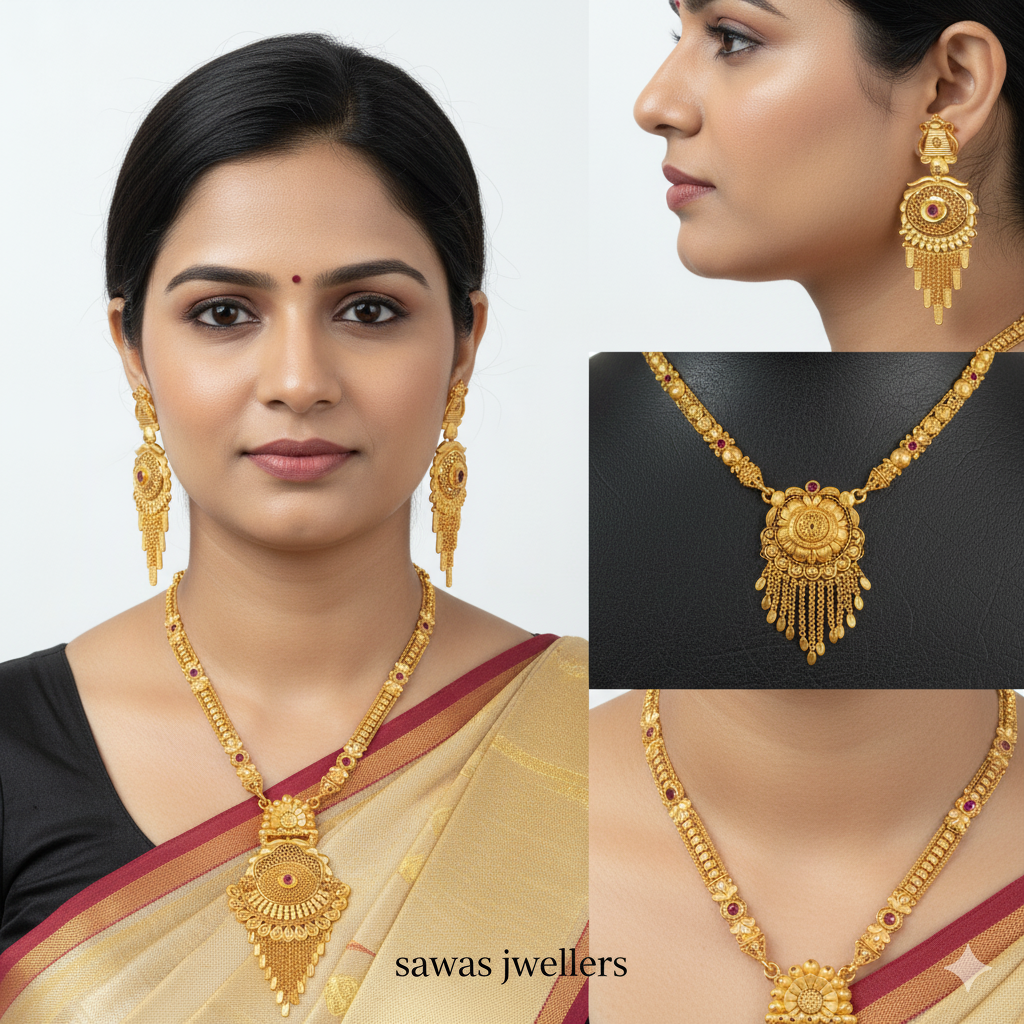 Discover the timeless beauty of our traditional gold necklace set, meticulously designed to complement your ethnic attire. Featuring a floral-inspired pendant and intricate detailing, this set exemplifies the finest craftsmanship and artistry that stunning jewelry deserves. Every piece is carefully made, ensuring high-quality materials and unmatched elegance.