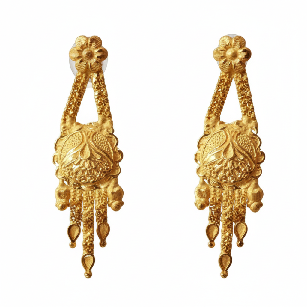 Discover the timeless beauty of this traditional gold necklace set, designed to captivate and elevate your special occasion outfits. This stunning set reflects the art of intricate handcrafted detailing, ensuring that every element is perfectly curated. The bold central pendant showcases delicate hanging drops, adding a touch of sophistication and charm to your overall look. Perfect for those seeking to celebrate their weddings or festive gatherings in grand style.