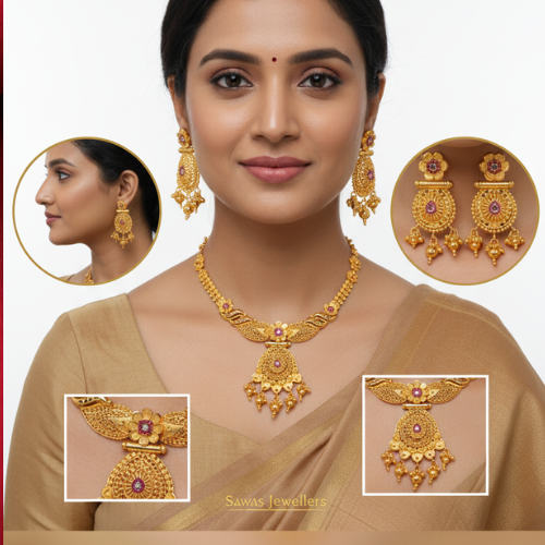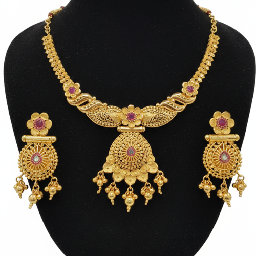 Discover the allure of classic craftsmanship with our traditional gold necklace set. Every piece in this set is meticulously handcrafted to ensure unparalleled quality and design. Featuring intricate detailing and a bold central pendant adorned with hanging drops, this jewelry is a testament to sophisticated artistry. Complemented by matching earrings, this set offers a complete look that radiates opulence, making it ideal for weddings, cultural events, and festive gatherings.