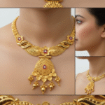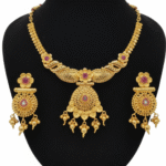 Enhance your bridal or festive attire with this exceptional gold necklace set. Designed to match traditional as well as contemporary clothing styles, it effortlessly lends a regal touch to sarees, lehengas, gowns, and other elegant outfits. Whether you’re walking down the aisle or attending a grand celebration, this jewelry piece ensures you stand out while respecting the cultural significance of gold in festive traditions. It’s the ideal accessory to complete your look and bring an air of sophistication to the occasion.