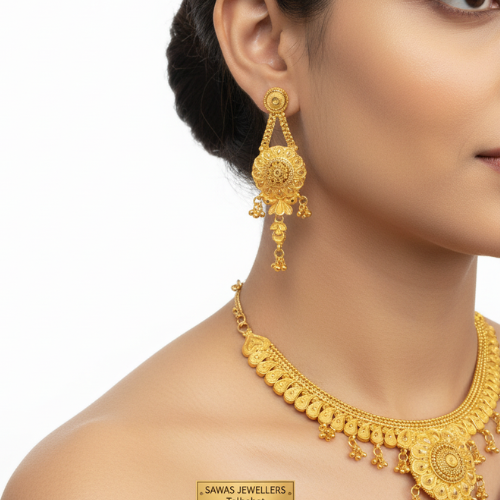 This beautiful necklace set comes with a matching pair of earrings, meticulously designed to complement the centerpiece. The necklace exhibits delicate teardrop filigree drops that add a graceful finishing touch, while the earrings mirror these details in a smaller yet equally impactful design. With its harmonious appearance, this set ensures you shine effortlessly at weddings, family gatherings, or festive celebrations.