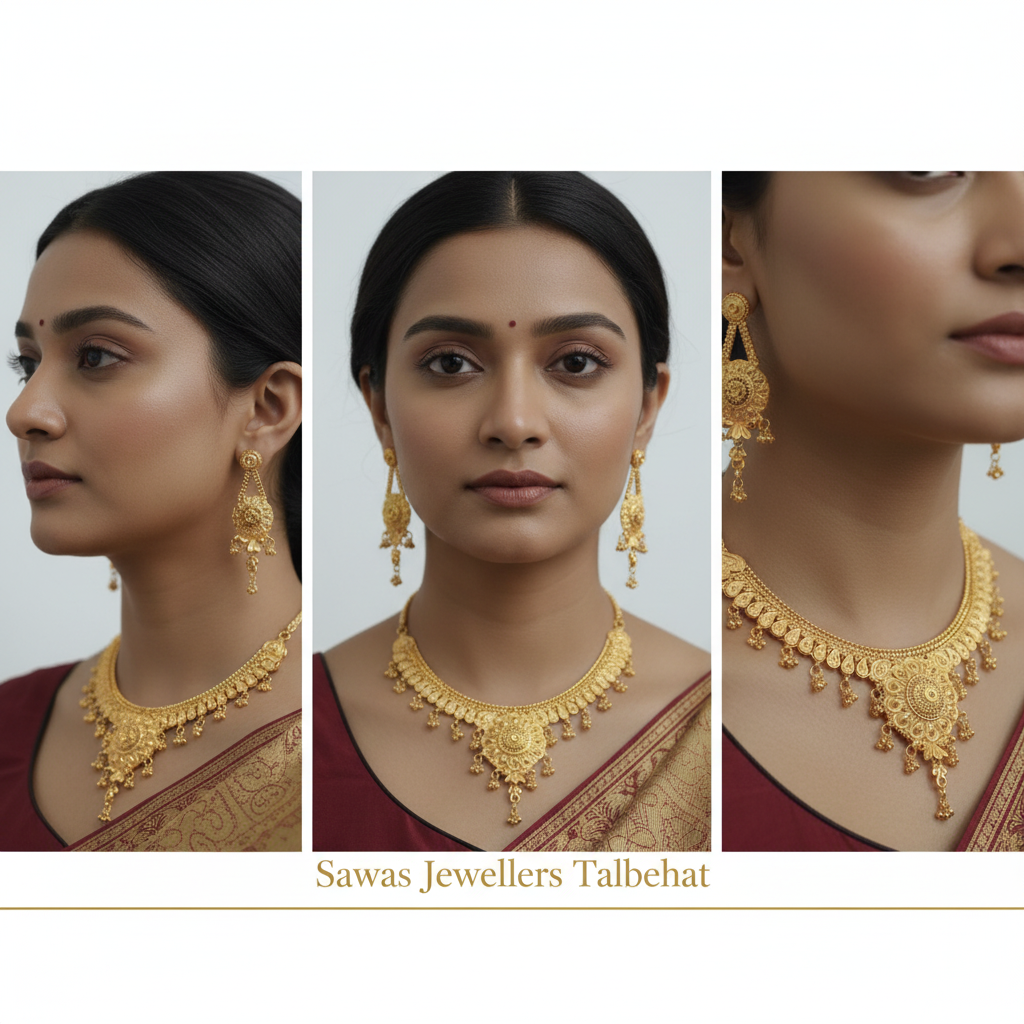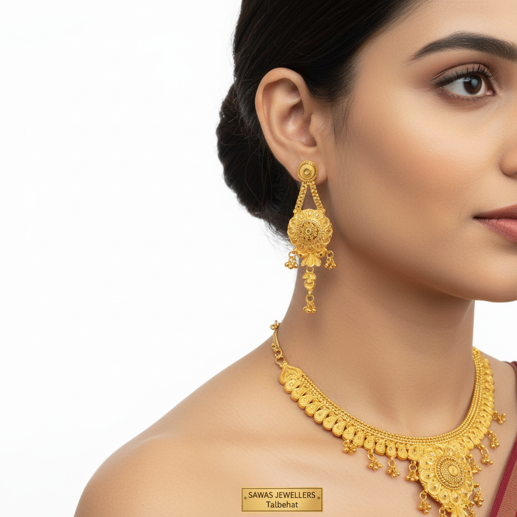 Elevate your style statement with our exquisite Golden Designer Necklace Set. Featuring round floral motifs intricately crafted with care, this jewelry piece blends timeless elegance with traditional charm. Light yet luxurious, it’s a perfect match for your sarees, lehengas, and festive wardrobes.