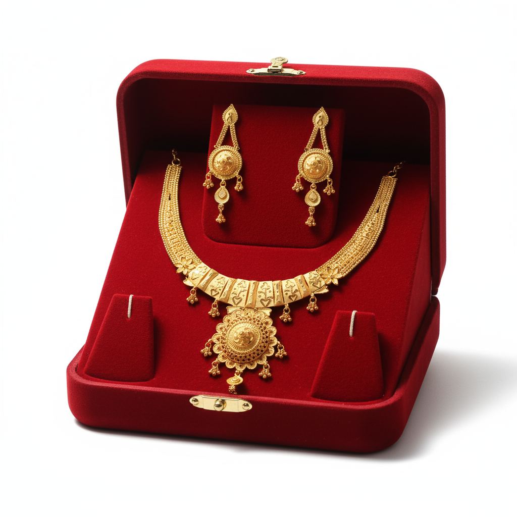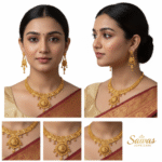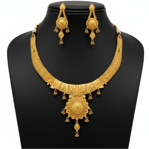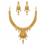This jewelry set is more than an accessory—it’s a statement of elegance and cultural heritage. Whether you’re attending a wedding, festival, or another formal gathering, this gold jewelry set will complement traditional attire and help you shine in the limelight. Its royal appeal combined with a timeless design makes it an ideal choice for anyone seeking an exquisite piece of jewelry to cherish.