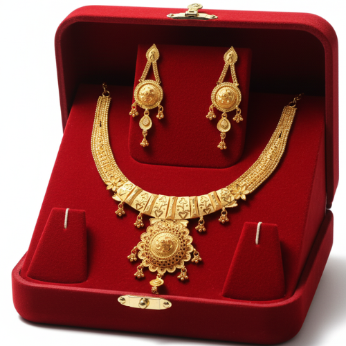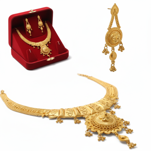 Bring sophistication and tradition to your next special occasion with this truly enchanting gold jewelry set, designed to capture the essence of elegance and culture.