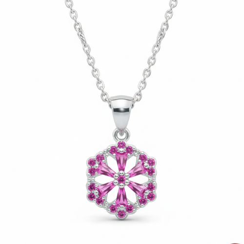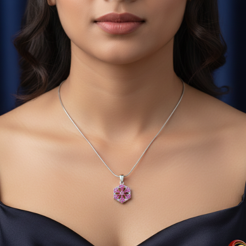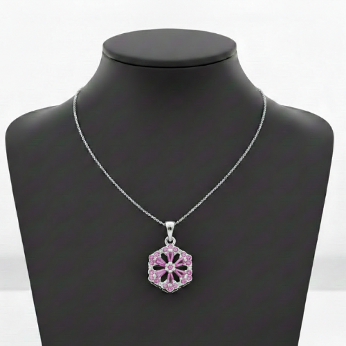Whether gifting a loved one or indulging yourself, this pendant is an ideal statement piece. Its radiant design and luxurious combination of silver and pink gemstones make it an unforgettable present for anniversaries, birthdays, or celebrations. Let this hexagonal floral pendant bring joy, sophistication, and vibrance to someone special—or to your own collection.