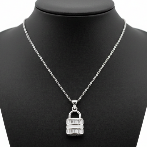 Discover a stunning piece of jewelry that blends modern sophistication with timeless symbolism. This silver-toned padlock pendant is more than just a decorative accessory—it’s a representation of strength, security, and commitment. With a structured padlock shape that exudes elegance, this pendant is designed for both daily wear and special occasions, making it a versatile addition to any jewelry collection.