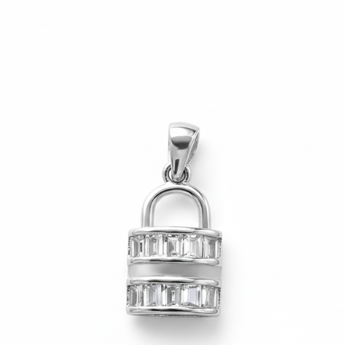 The pendant features a polished, rounded shackle on top, adding a subtle, curved contrast to the geometric shape of the padlock. A tapered bail completes the design, ensuring a secure attachment to your preferred chain style. The high-shine, reflective finish further elevates the look, making the pendant a perfect match for a silver chain or contrasting metal for an edgy vibe. Its radiant brilliance complements the intricate geometrical brilliance of its baguette-cut stones.
