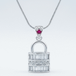 The highlight of this pendant is its intricate design. Two horizontal rows of channel-set baguette-cut stones shimmer brilliantly and create a glamorous visual effect. A smooth, polished silver band separates the rows, introducing a sleek architectural feature that enhances the pendant’s clean and structured aesthetic. Every detail has been thoughtfully crafted to ensure maximum shine, durability, and visual appeal, giving you a piece constructed with meticulous precision.