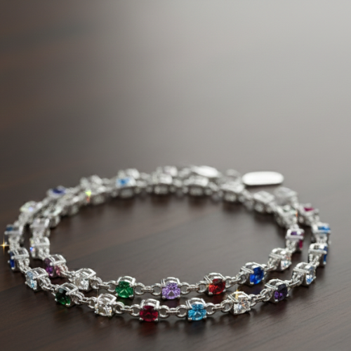 Bring a delightful touch of detail with our charmed elegance pieces. These delicate silver link chains feature decorative charms including bezel-set marquise stones, rose-gold-toned stars, hearts, and oxidized floral motifs, offering an enchanting aesthetic inspired by traditional designs. For a sleek, contemporary option, explore our modern geometric shimmer collection. With alternating bezel-set round stones and hollow rectangular links or vibrant gemstones set in textured silver, these designs are perfect for making a statement while maintaining versatility.