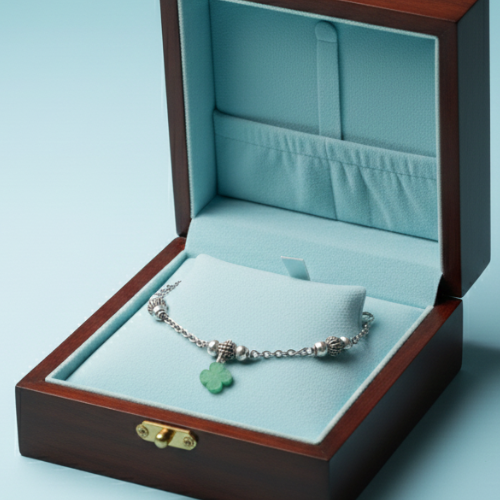 Charms: A distinctive green four-leaf clover charm hangs near the clasp, combining contemporary design elements with traditional aesthetics. This charm adds a unique, personalized touch to the timeless accessory.