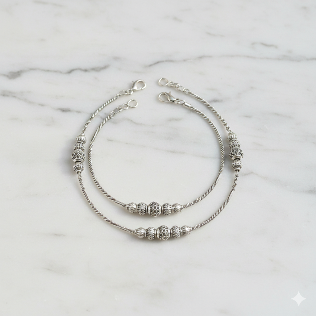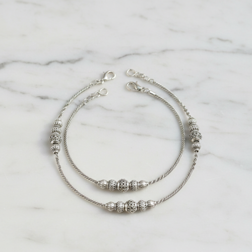 Enhance your jewelry collection with these stunning silver-toned payals, traditional Indian anklets that effortlessly combine cultural heritage and contemporary style. Each piece is thoughtfully crafted to resonate with the significance of Indian traditions, while still appealing to modern aesthetic sensibilities. Whether you’re dressing for a festive occasion or adding charm to your everyday attire, this versatile collection offers something for everyone.