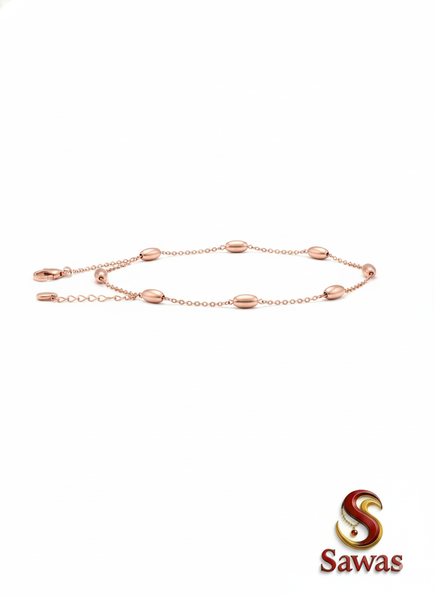 Silver Oval-Bead Payal: Featuring a minimalist station chain design, this anklet is adorned with polished silver-toned oval beads, resembling classic rice beads. Its modern aesthetic and ergonomic structure make it ideal for everyday wear.