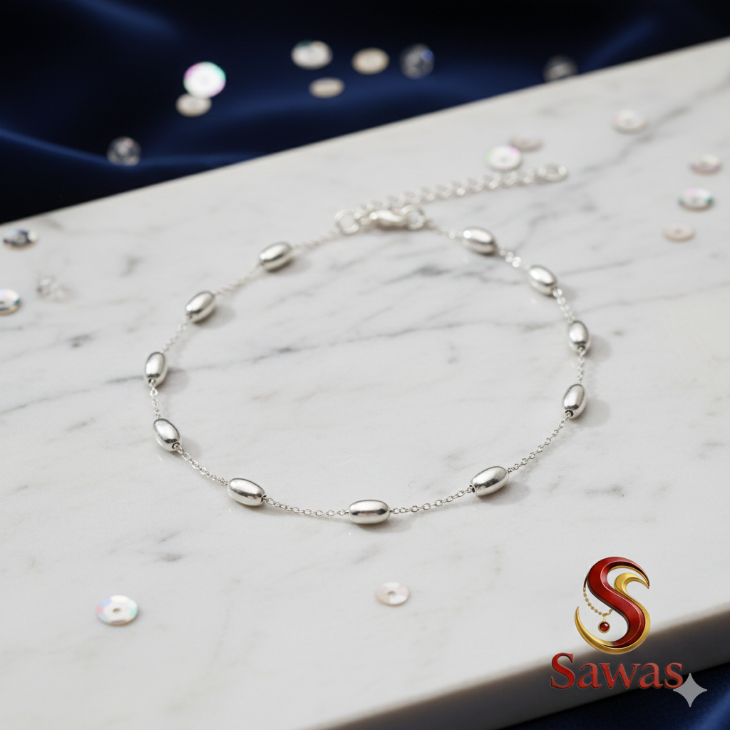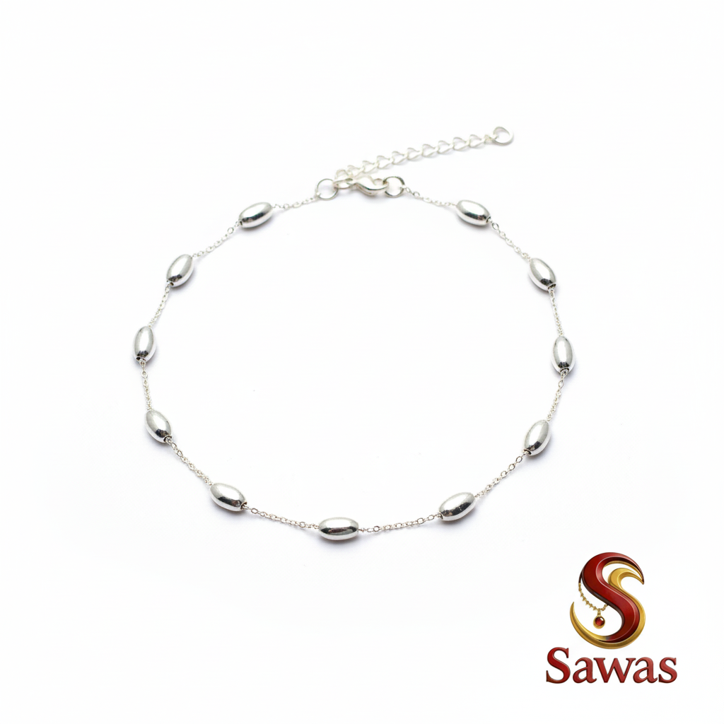 Crafted with precision and care, this anklet showcases a high-quality silver-toned finish, offering a luxurious aesthetic at an accessible price point. The artificial silver or silver-plated material ensures durability while maintaining a premium appearance. Whether you’re searching for an anklet to wear daily or an accessory to elevate special occasions, the Sawas Silver Oval-Bead Anklet promises longevity and charm without compromising on quality.