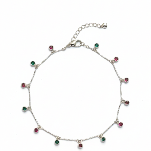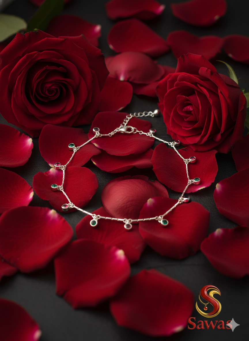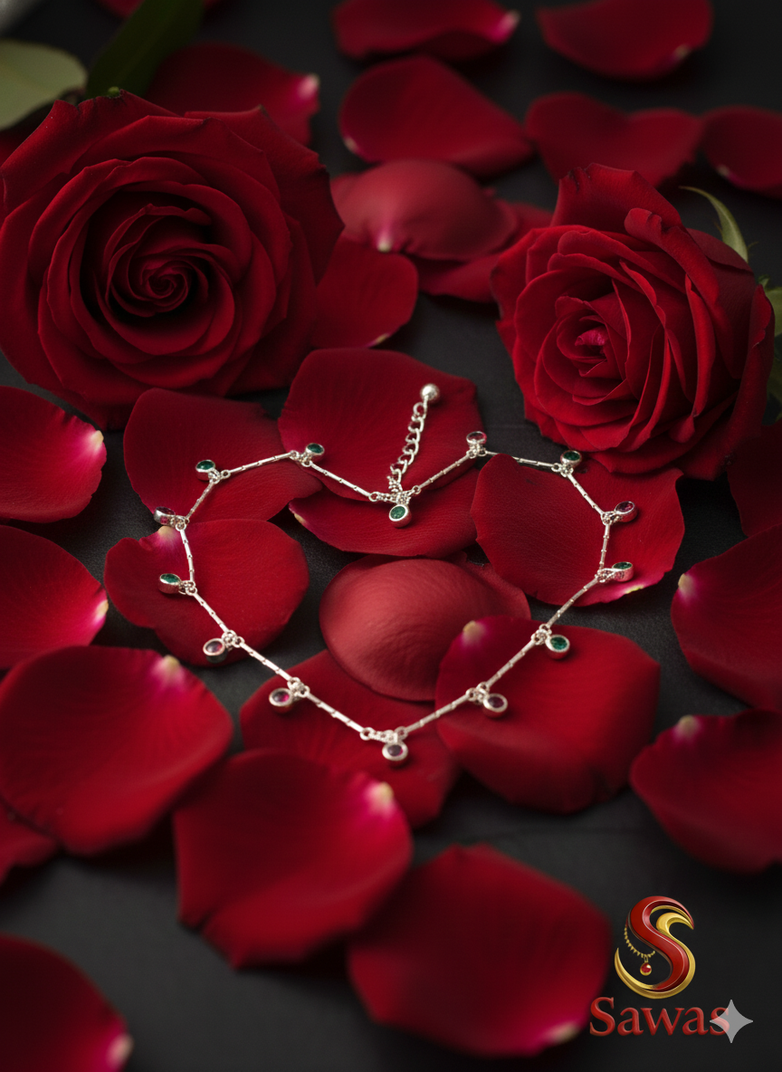 Add a splash of sophistication with the Multi-Color Gemstone Inset Payal. This modern design uses a thin bar-link chain embedded with round-cut gemstones, alternating between deep pink and emerald green hues. Each stone delicately set in a silver-toned bezel provides a contemporary statement piece that’s ideal for a bold, fashionable edge. The adjustable lobster clasp ensures a sleek fit for any ankle size.
