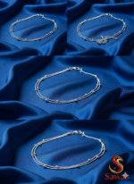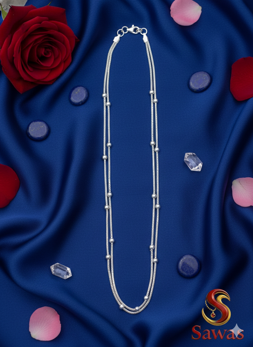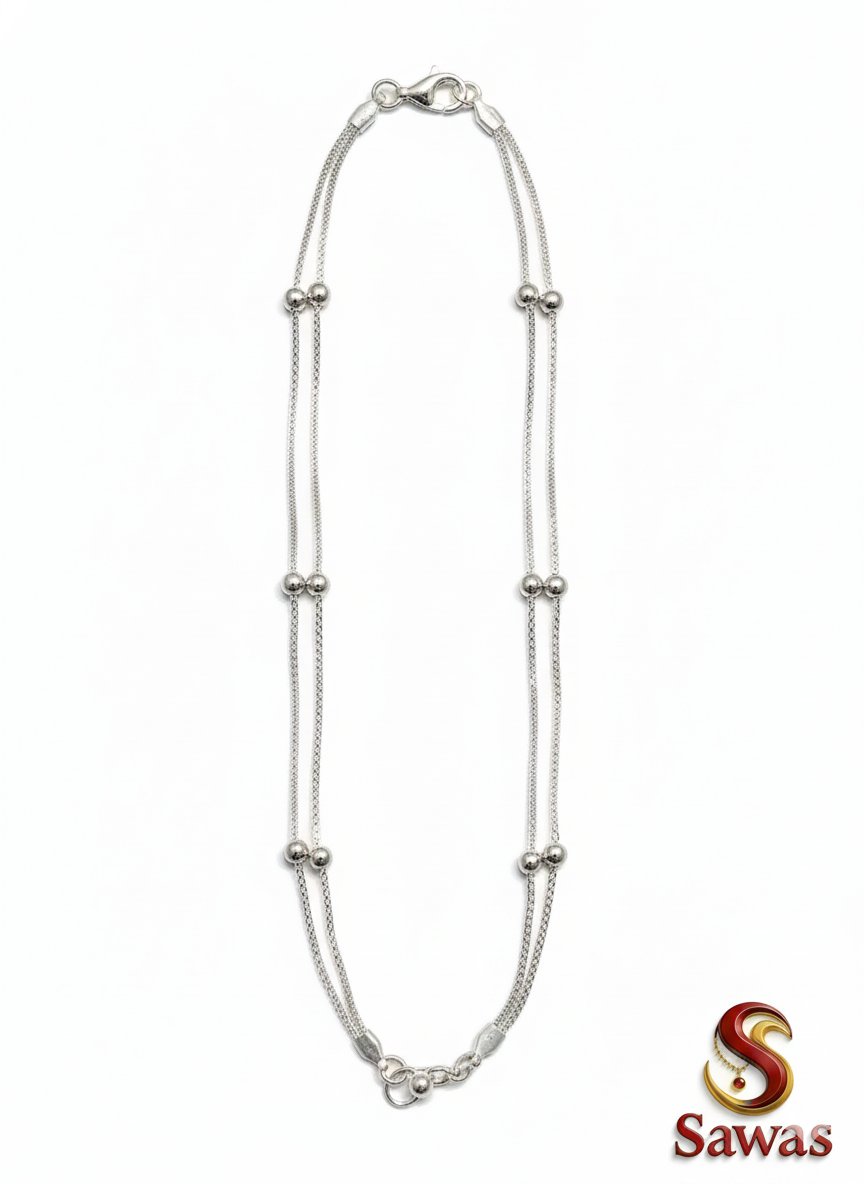 Luxuriously stylish, the Double-Strand Oval-Bead Payal combines two parallel silver-toned chains for a layered effect while retaining a refined aesthetic. Its polished oval beads create visual richness, enhancing the ornate design. Equipped with a secure lobster clasp and adjustable extender chain finished with a decorative bead, this piece offers a touch of elegance to complement both grand and subtle occasions.