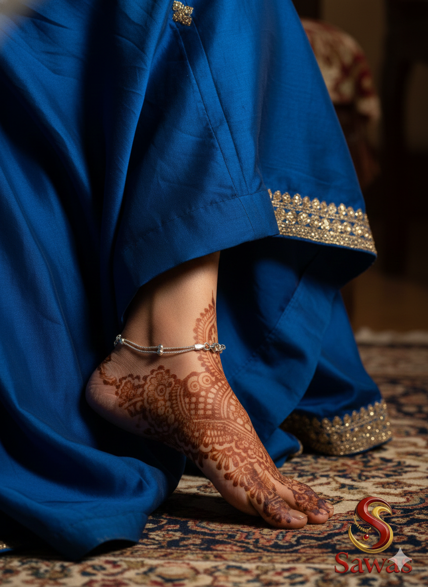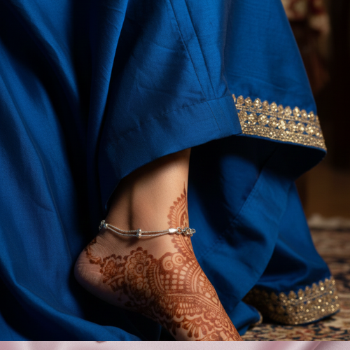 The Emerald-Green Station Payal embodies timeless sophistication. With its evenly spaced emerald-green faceted beads nestled between tiny silver spacer beads, this anklet exudes understated elegance. Ideal for festive and daily wear, it offers affordable luxury that complements a wide variety of wardrobe staples with effortless class.