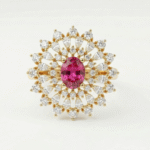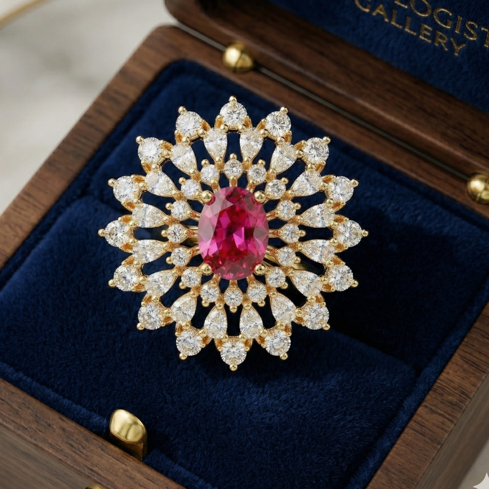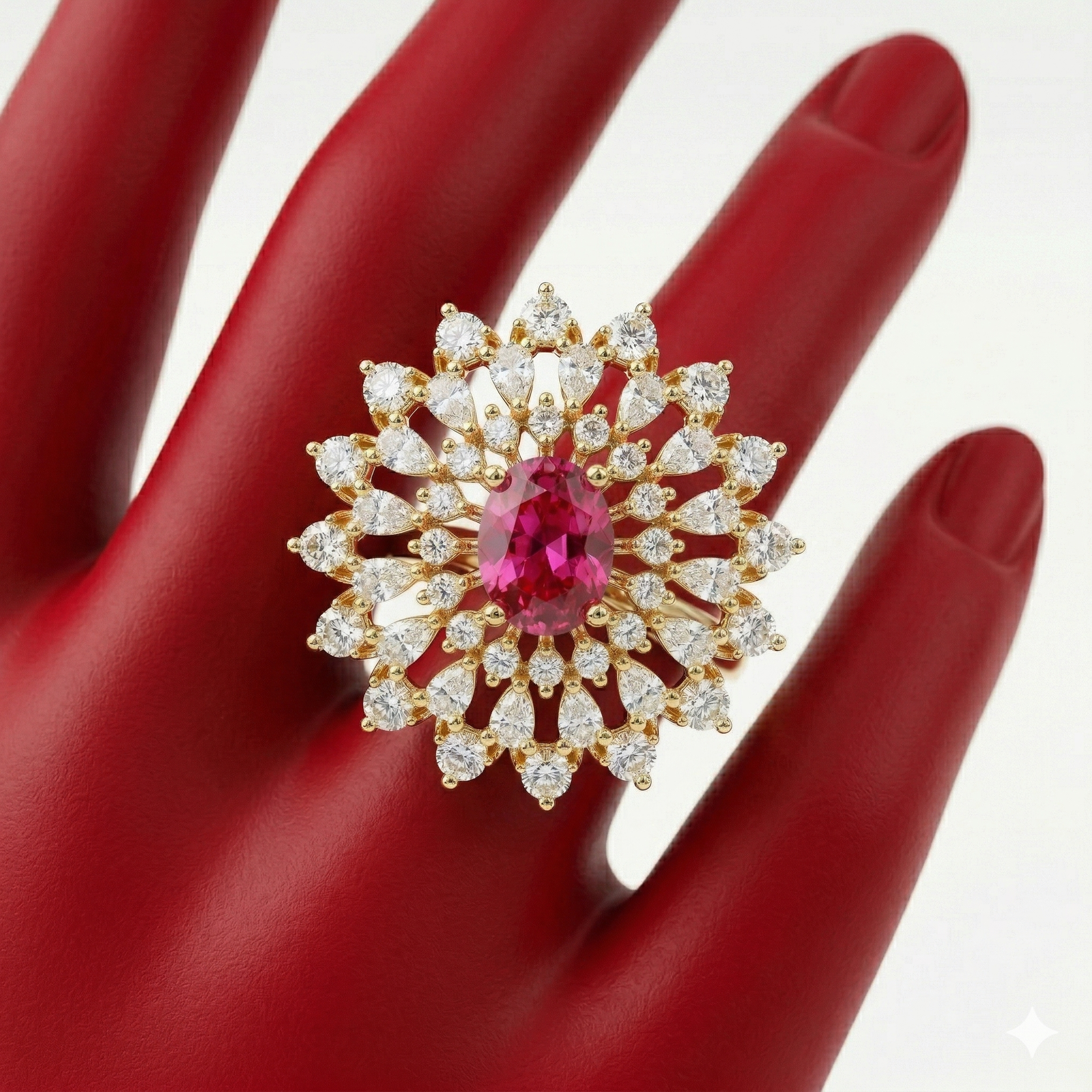 Introducing the magnificent Floral Sunburst Cocktail Ring, a bold yet intricate masterpiece featuring a vibrant oval-cut ruby (or pink-red gemstone) as its centerpiece. The gemstone is held securely within a classic four-prong yellow gold setting, ensuring durability and timeless elegance.