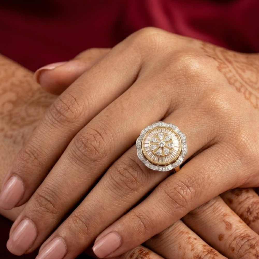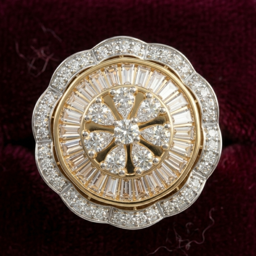 Designed in a sophisticated two-tone setting, this ring blends the warmth of yellow gold with the cool elegance of white gold, creating a harmonious and eye-catching contrast. This architectural statement piece is ideal for weddings, red-carpet events, or as the centerpiece of your jewelry collection.