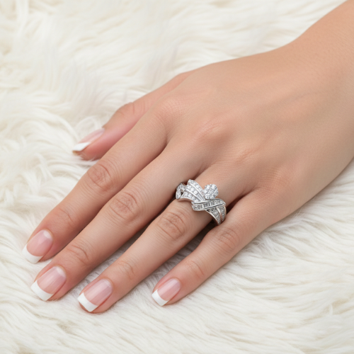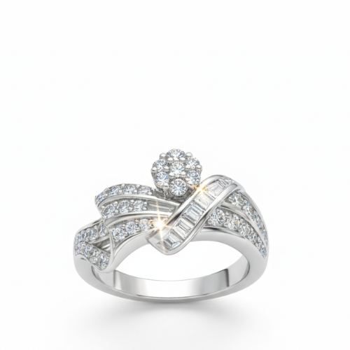 The centerpiece of this ring is a radiant floral cluster that captures the essence of nature-inspired beauty. Surrounding the design, the split-shank band offers a unique crossover “ribbon” effect, which combines pave-set round crystals with a dazzling row of baguette-cut stones. Together, these elements create a harmonious blend of sparkle, texture, and brilliance. Every detail has been thoughtfully considered to ensure the ring’s luxurious and eye-catching appeal.