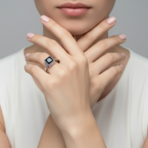 Sophistication takes center stage with the Square Black Stone Solitaire. This understated yet striking ring showcases a square-cut black gemstone — likely onyx or a black diamond — set in a bezel or partial bezel setting. Its polished, slender band in silver or white gold creates a sleek and modern profile. Minimalistic yet bold, this design is perfect for anyone seeking a versatile piece that can transition effortlessly from casual outings to formal events.