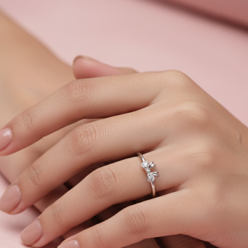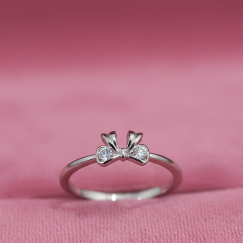 An understated charm defines the minimalist Simple Bow Ring. This slender silver or white gold band boasts a stylized bow motif at its center—delicate yet impactful. The bow’s “knot” is adorned with two small, sparkling accent stones, completing the design with a sophisticated yet playful shine. This ring is ideal for everyday wear or a graceful accent to formal attire.