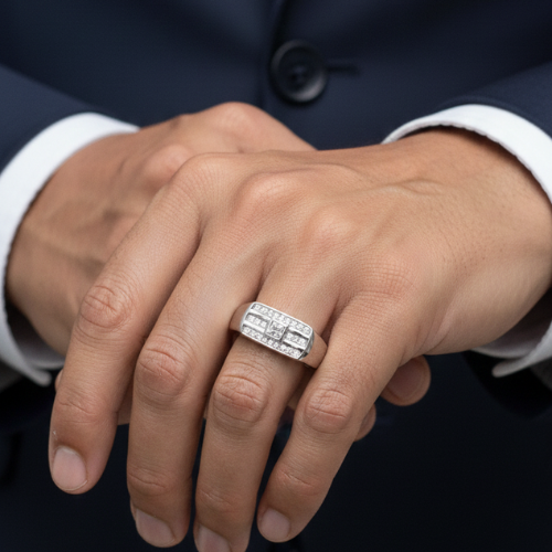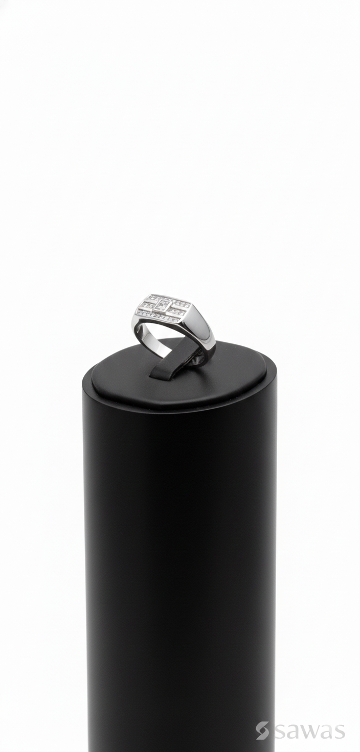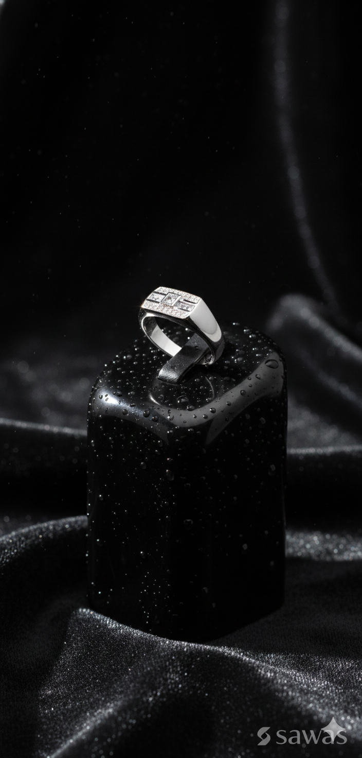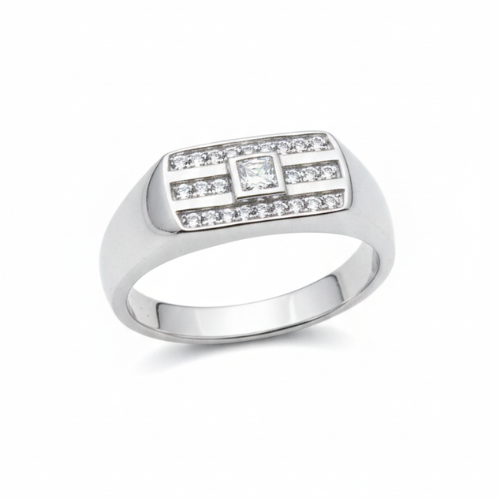 Discover the ultimate blend of style and sophistication with our silver-toned men’s ring. Featuring a square-cut center stone, this ring is designed to make a statement. Surrounding the centerpiece are sparkling accent diamonds, meticulously arranged in a modern striped pattern that exudes a refined yet bold aesthetic. This striking design ensures the ring stands out, whether worn casually or for a special event.