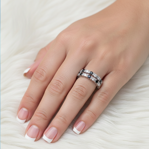 Discover a stunning blend of sophistication and modernity with this exquisite double-row band ring. Crafted in premium silver or white gold, this ring captivates with its bold and elegant look. Each row alternates between shimmering clear stones, which evoke timeless brilliance, and striking black stones, delivering a unique contrast. Whether you’re dressing up for an evening gala or adding a touch of glamour to your everyday style, this statement band is sure to turn heads and spark conversations.
