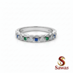 Turn heads with the stunning Multi-Color Band Ring, designed for those who adore vibrant and timeless accessories. Made with 92.5 sterling silver, this eternity-style band is a masterpiece of intricate detailing. The band features a repetitive pattern composed of marquise and round shapes, each studded with alternating gemstones in clear white, deep blue, and rich green hues. The subtle yet striking color combination makes it a versatile piece that pairs effortlessly with a variety of outfits, whether casual or formal. Its elegant design brings the perfect balance of playfulness and sophistication, making it a must-have for any jewelry lover.
