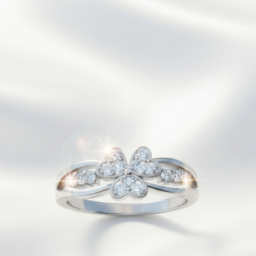 Indulge in timeless beauty with this exquisite silver or white gold ring, designed to captivate attention and make every moment special. The central feature is a stunning four-leaf clover motif, where each heart-shaped leaf is crafted from clusters of radiant small diamonds. This gracefully floral-inspired design exudes charm and sophistication, making it the perfect statement for heartfelt occasions.