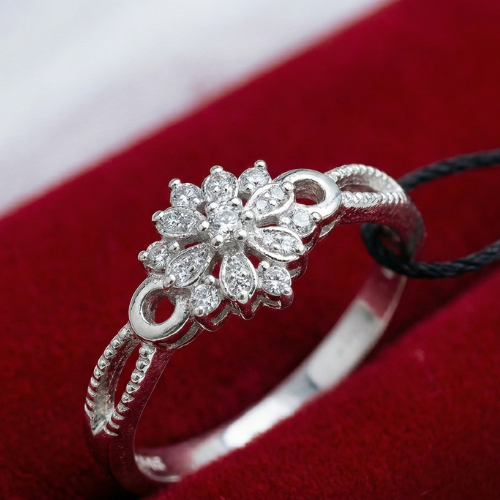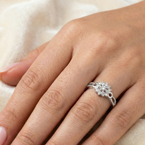 The Diamond Flower Cluster Ring is a showstopper, featuring a central flower design made of marquise and round-cut stones, set in silver or white gold. The delicate textured split-shank band adds a unique charm, ensuring this piece radiates sophistication and textured brilliance. Perfect for events that require a touch of grace and style.