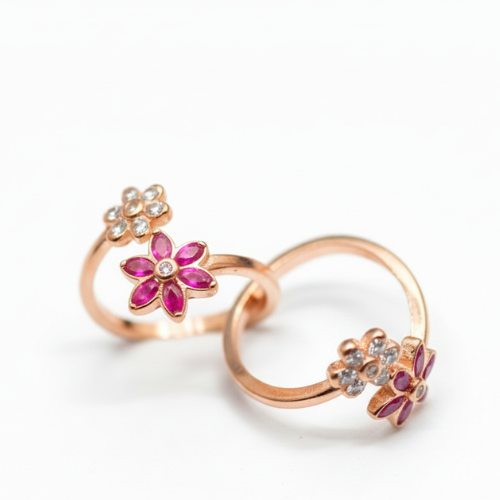 The Dual-Flower Open Rings feature breathtaking silver and rose gold-tone designs with floral-inspired accents. Each ring showcases two delicate flowers—one adorned with sparkling clear stones and the other featuring subtle pink gems. These eye-catching and feminine designs combine elegance with a modern twist, making them the perfect accessory for a romantic evening or a stylish daytime look.
