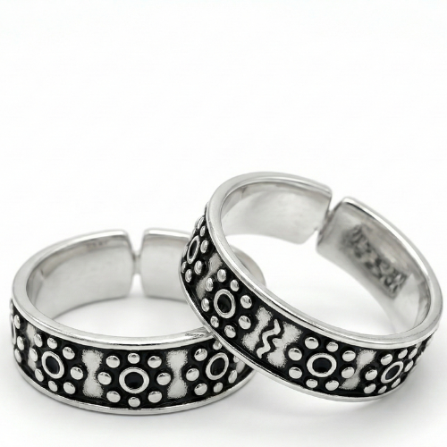Add a touch of vintage flair to your look with these bold and stylish adjustable silver toe rings. Featuring an oxidized finish for a striking dark contrast, the detailed design incorporates intricate circular motifs and mesmerizing wavy lines, making these toe rings a standout accessory. Perfect for casual outings or special occasions, the combination of artistry and durability ensures lasting appeal.